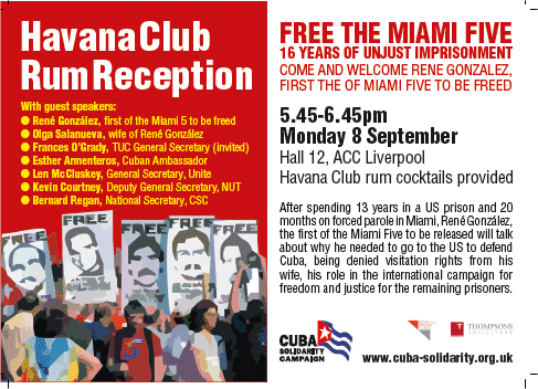 René, the first of the Cuban Five to have been released, was due to have addressed the TUC Congress in person on Wednesday, September 10, but instead was forced to record a video message for delegates after his visa was denied for the second time this year.