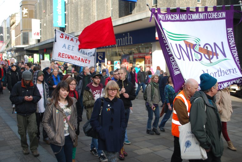 Rally to mark the 10th anniversary of the February 15th London mass demonstration opposing the attack on Iraq: For a Future Without War!Militant Save Our Services Demonstration through Newcastle on February 16