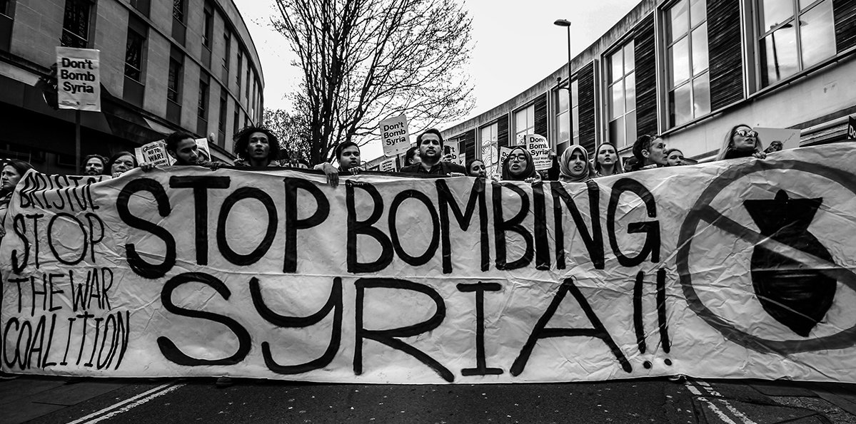 "The response to the strikes by Trump, Macron and May on Syria has been remarkable, with protests, vigils, lobbies and rallies across the country and a social media storm against the attack. We have received information about emergency protests which took place in over 40 towns and cities all across the country, including in Aberdeen, Aberystwyth, Bangor, Birmingham, Bournemouth, Bristol, Cardiff, Chester, Doncaster, Edinburgh, Exeter, Hull, Isle of Wight, Leeds, Leicester, Liverpool, Milton Keynes, Minehead, Manchester, Norwich, Newcastle, Nottingham, Orkney, Plymouth, Sheffield, Southampton, Swansea and Wolverhampton.