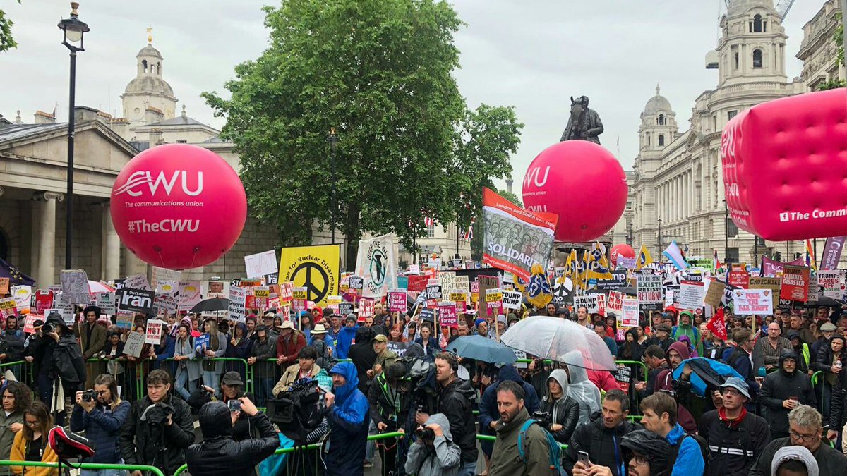 The demonstration on June 4 assembling in Trafalgar Square was a main focus of events, and was called by Together Against Trump, which is a united front of the Stop Trump Coalition and Stand Up To Trump, bringing together a host of campaign groups and trade unions, such as the Campaign for Nuclear Disarmament and the Stop the War Coalition, Unite the Union and Unison. In high spirits, the tens of thousands then marched down Whitehall as far as the stage erected as near Downing Street as the authorities would allow. So dense was the crowd that it was almost impossible to move, and as the rally progressed a steady stream of people also joined.
