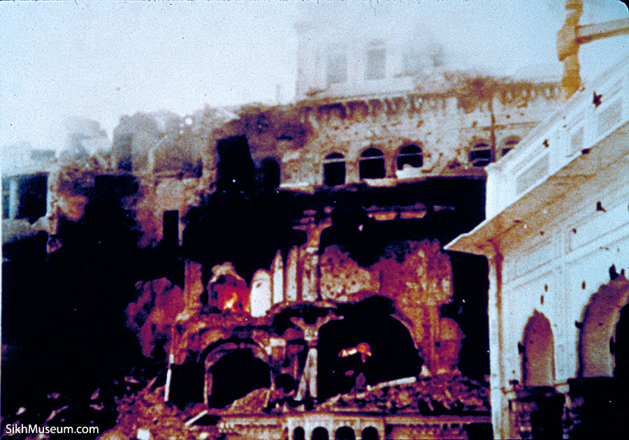 Remnants of the Akal Takht consumed by fire. Large bullet
