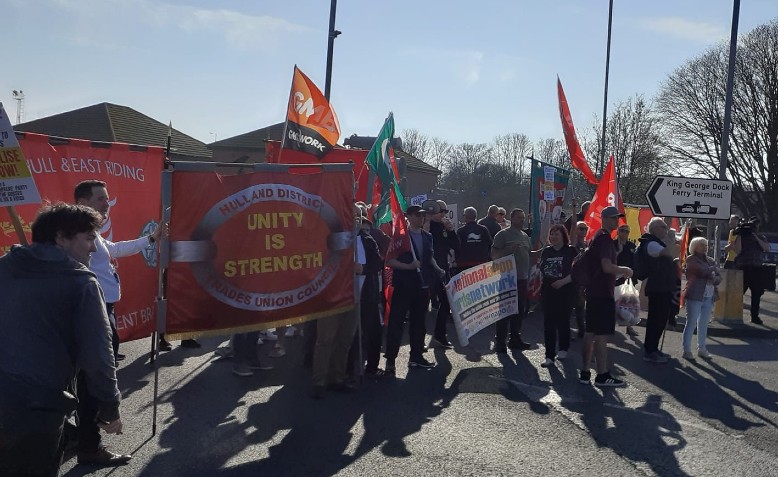 Protesters marching in solidarity with P&O workers in Hull blockaded the entrance to King George Dock. Marching behind a group of motorcycle outriders, the demonstration marched down Hedon Road stopping traffic and shouting slogans. Once back at the dock entrance, a human blockade stopped access onto King George Dock to delay loading the ferry, Pride of Rotterdam.
