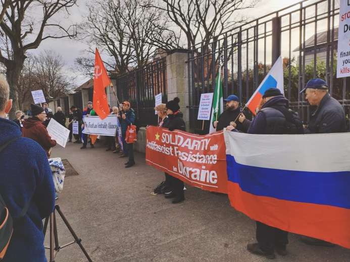 Activists gathered at the British Embassy in Dublin on Saturday, February 4, to protest against Britain's role in sabotaging the peace negotiations last year, prolonging the war with massive arms deliveries, the active involvement of British military personnel in the fighting in Ukraine, and years of training and arming Banderite Nazi battalions and covering up their horrific crimes against civilians in the Donbas and other Russian-speaking parts of Ukraine.