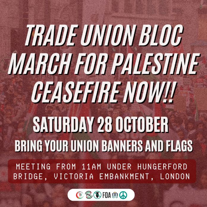 "We urge all trade unions to stand with the Palestinian people in Gaza and beyond. Every union should debate what steps can be taken to challenge British complicity with Israel's war machine and the ongoing dispossession of Palestinians. As a first step, we urge every trade unionist to attend demonstrations in support of the Palestinians along with their union banners to show they are not alone in their struggle for justice."