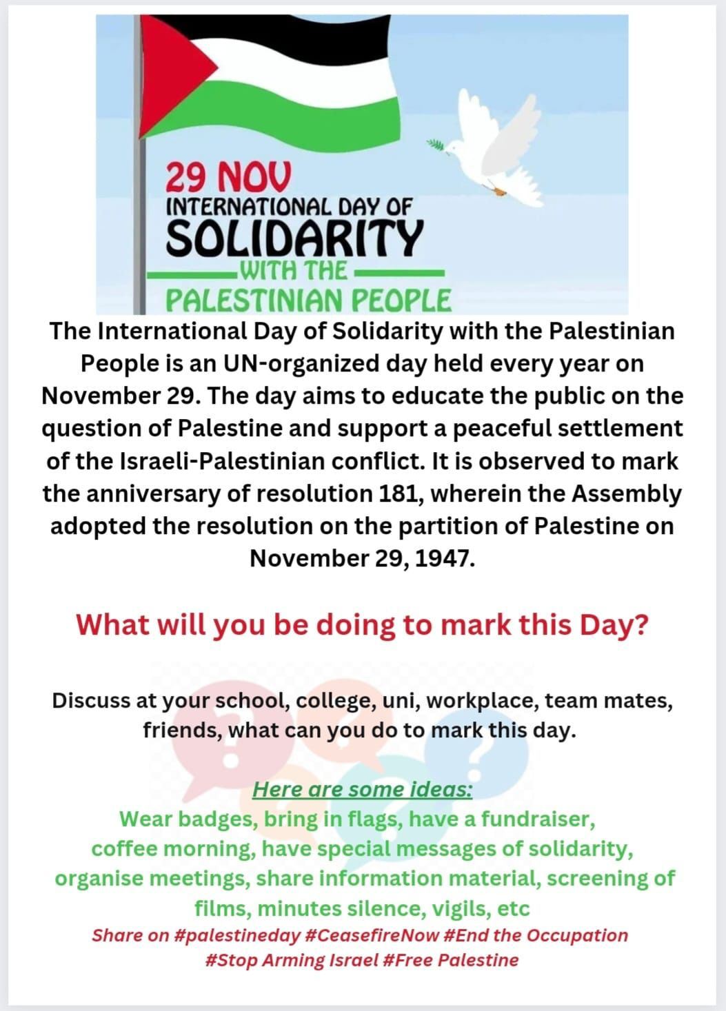 Wednesday, November 29, marked the International Day of Solidarity with the Palestinian People which has been observed on November 29 each year by the UN since 1977. This year people around the world staged rallies and walkouts in their thousands to mark the International Day of Solidarity with the Palestinian People condemning Israel's heinous war on Gaza and the West Bank killing a reported of at least 15,000 people including over 5,000 thousand children. The walkouts [1] called for a permanent ceasefire following Israel's being forced to agree a temporary ceasefire for an exchange of Palestinian prisoners - many who have never been charged, and many of them children (or, as many press reports here say, "persons under 18") - with the Israeli hostages in Gaza held by Hamas.